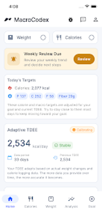 O MacroCodex Adaptive TDEE é um aplicativo gratuito para Android que simplifica o controle das calorias diárias necessárias para atingir suas metas de saúde e fitness. Ao registrar a ingestão calórica e o peso corporal de forma regular, o aplicativo fornece uma estimativa precisa do gasto energético diário, ajustando automaticamente as metas de calorias com base nas mudanças reais de peso e na ingestão de alimentos. Isso o torna uma ferramenta valiosa para quem busca perda de gordura, ganho muscular ou recomposição corporal.